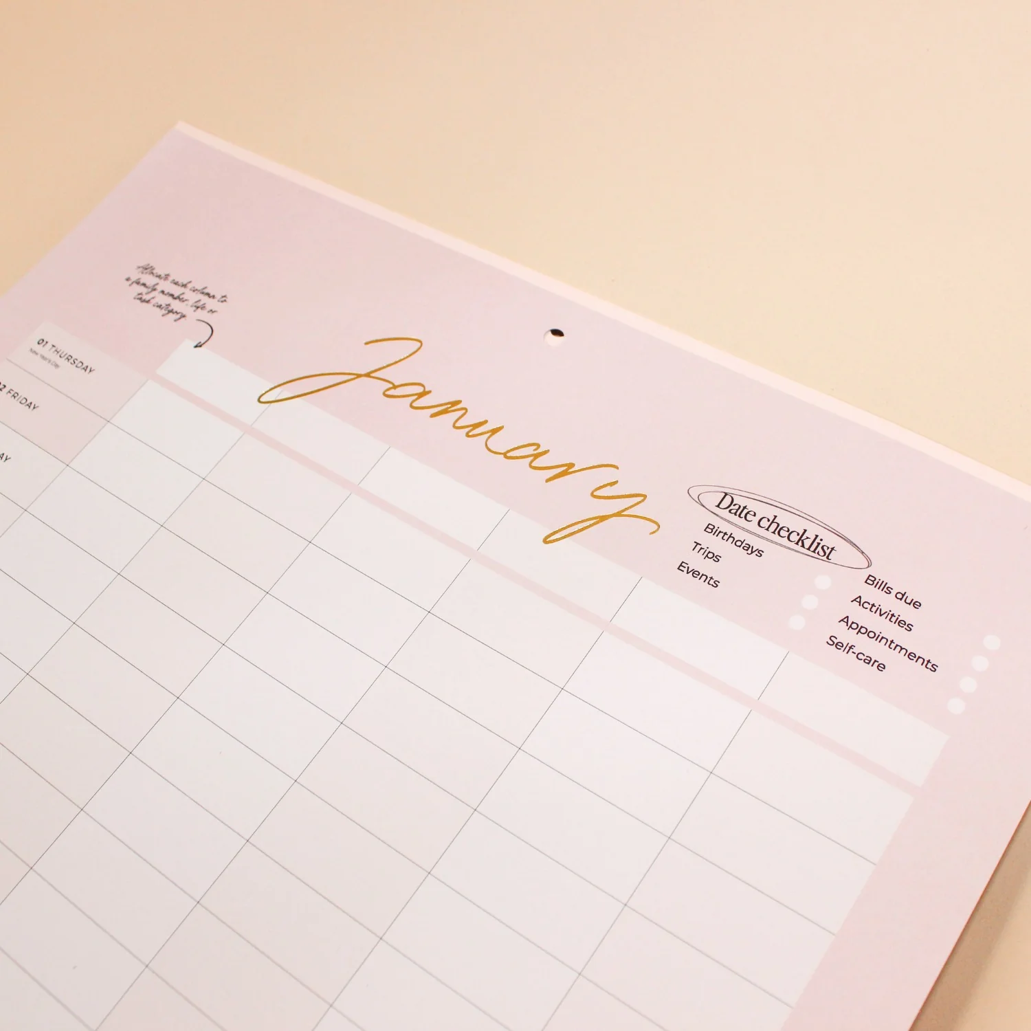 - Page colours alternate per month, for example, January page is blush, February is beige.