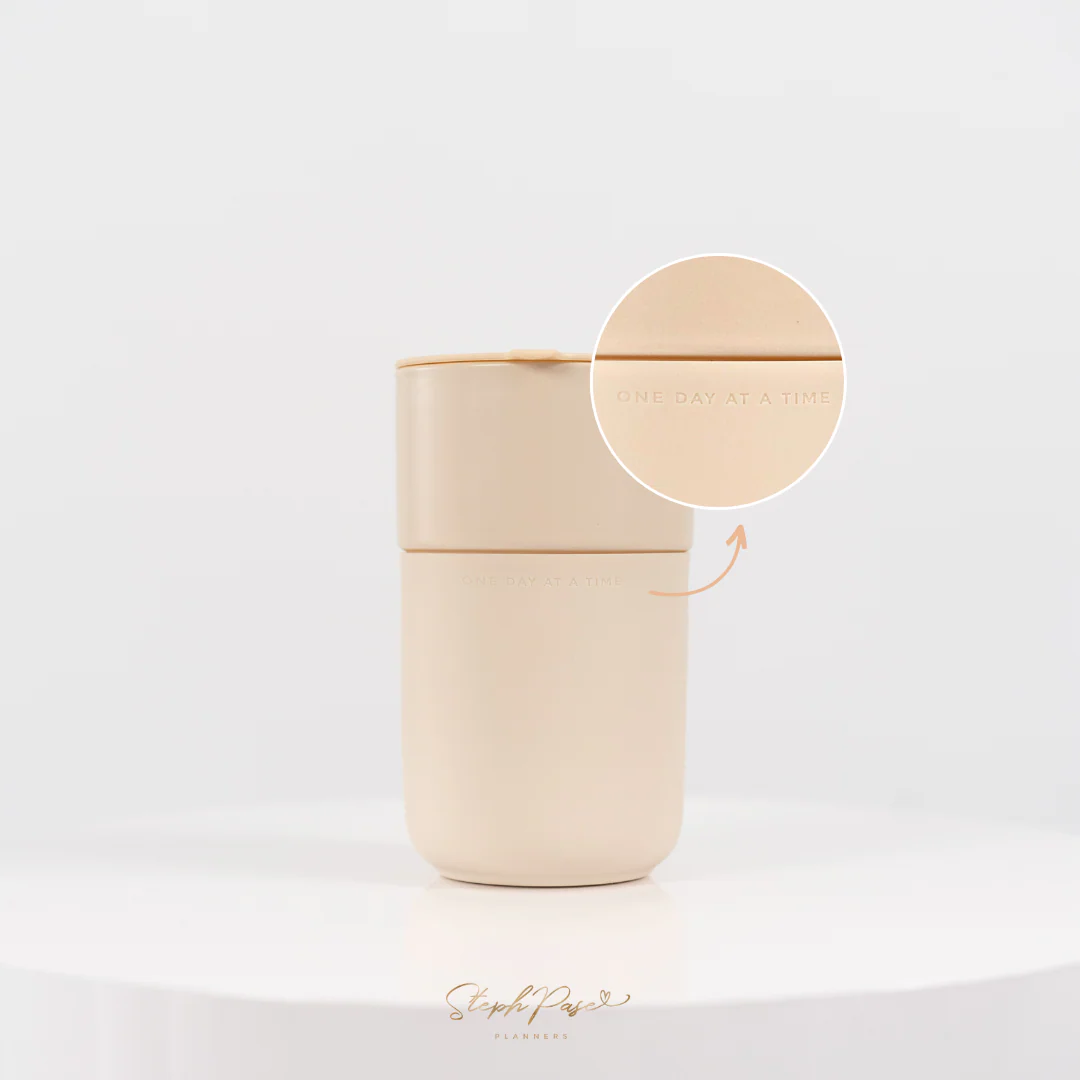 - Beige coloured mug with 'One Day at a Time' quote engraved into the silicone