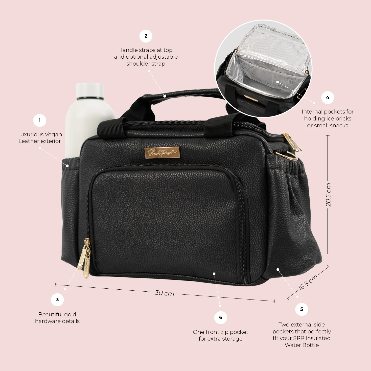 - 2 x external side pockets - that perfectly fit your SPP Insulated Water Bottle