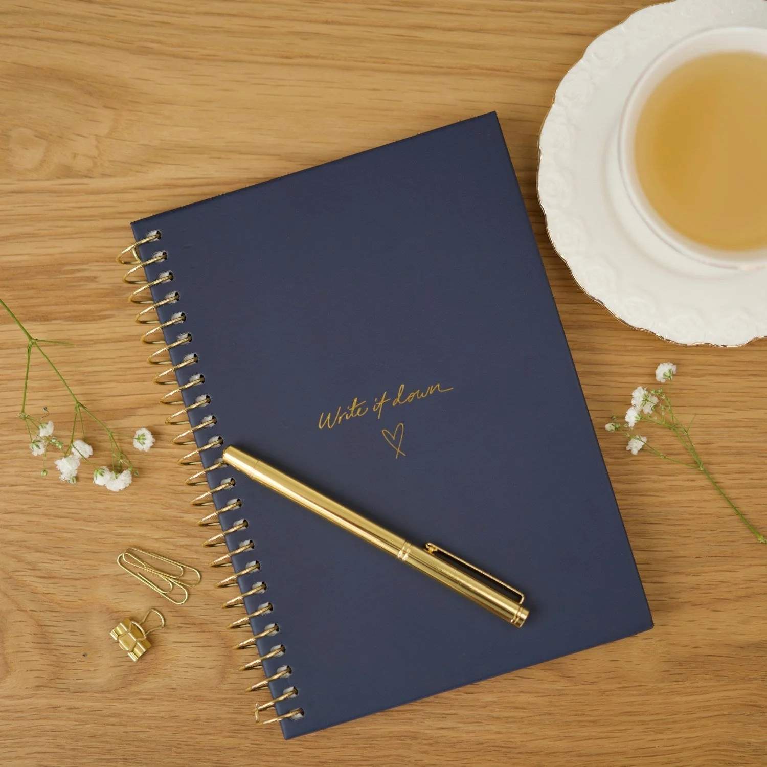Introducing... the restocked and revamped signature 'Write it Down' A5 Notebook! The perfect little notebook for all your notes, ideas, to-do lists, dreams, journalling, inspiration and so much more! Featuring a luxe gold spiral and gold calligraphy 'Write it out' message on the cover, this spiral notebook is a beautiful addition to your stationery line up.